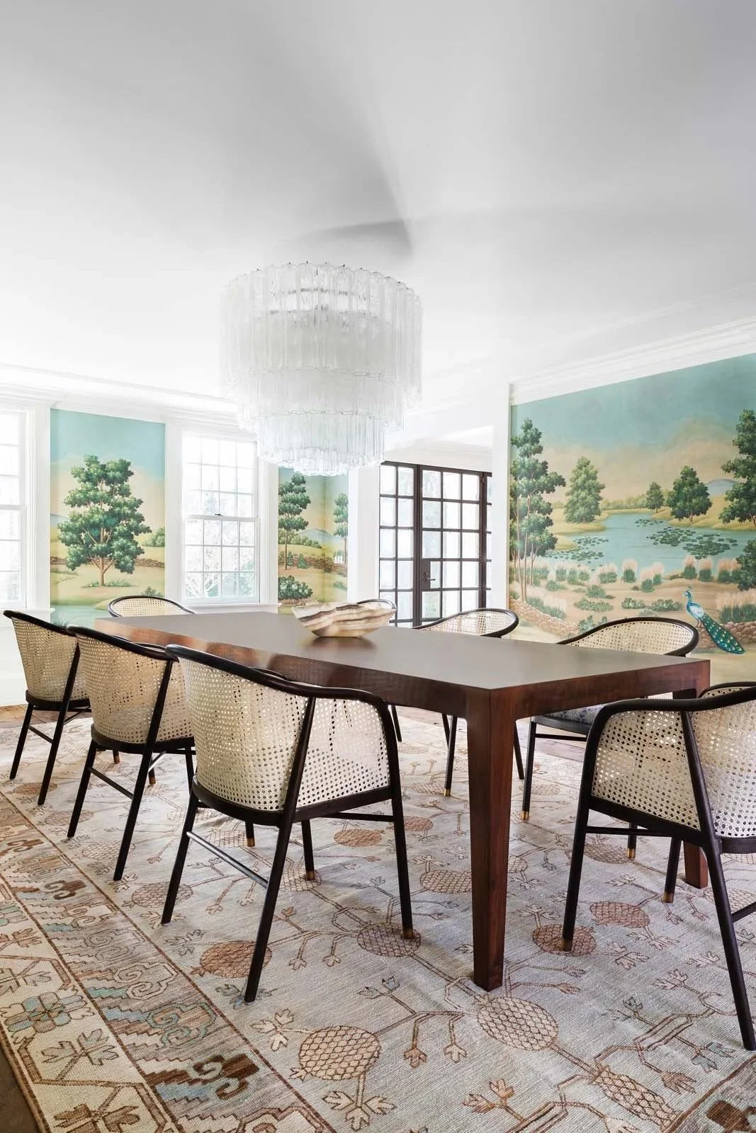 This home is a masterclass in "Modern Traditional" design, where classic architectural bones are reimagined through vibrant, contemporary layering. The interiors feature a sophisticated interplay of textures, from the immersive, panoramic wallcoverings in the dining room to the clean lines of sculptural lighting and tactile cane seating. By treating each space with the precision of an art consultation, the design balances modern finishes with organic elements, creating a curated home that feels both historically storied and refreshingly current.